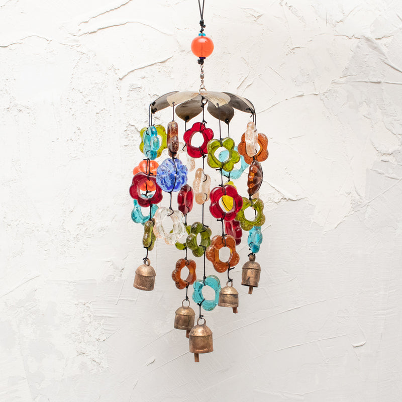 Featuring colourful handblown glass beads in the shape of flowers. This is truly a one of a kind bell.