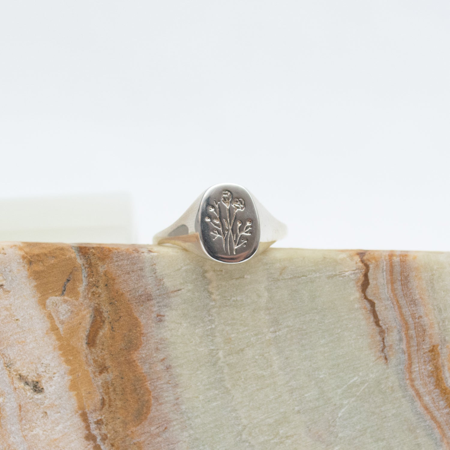 Hand engraved signet sterling silver ring. Cast in recycled metal and finished by hand. Made by Claus in Kingston, NY.