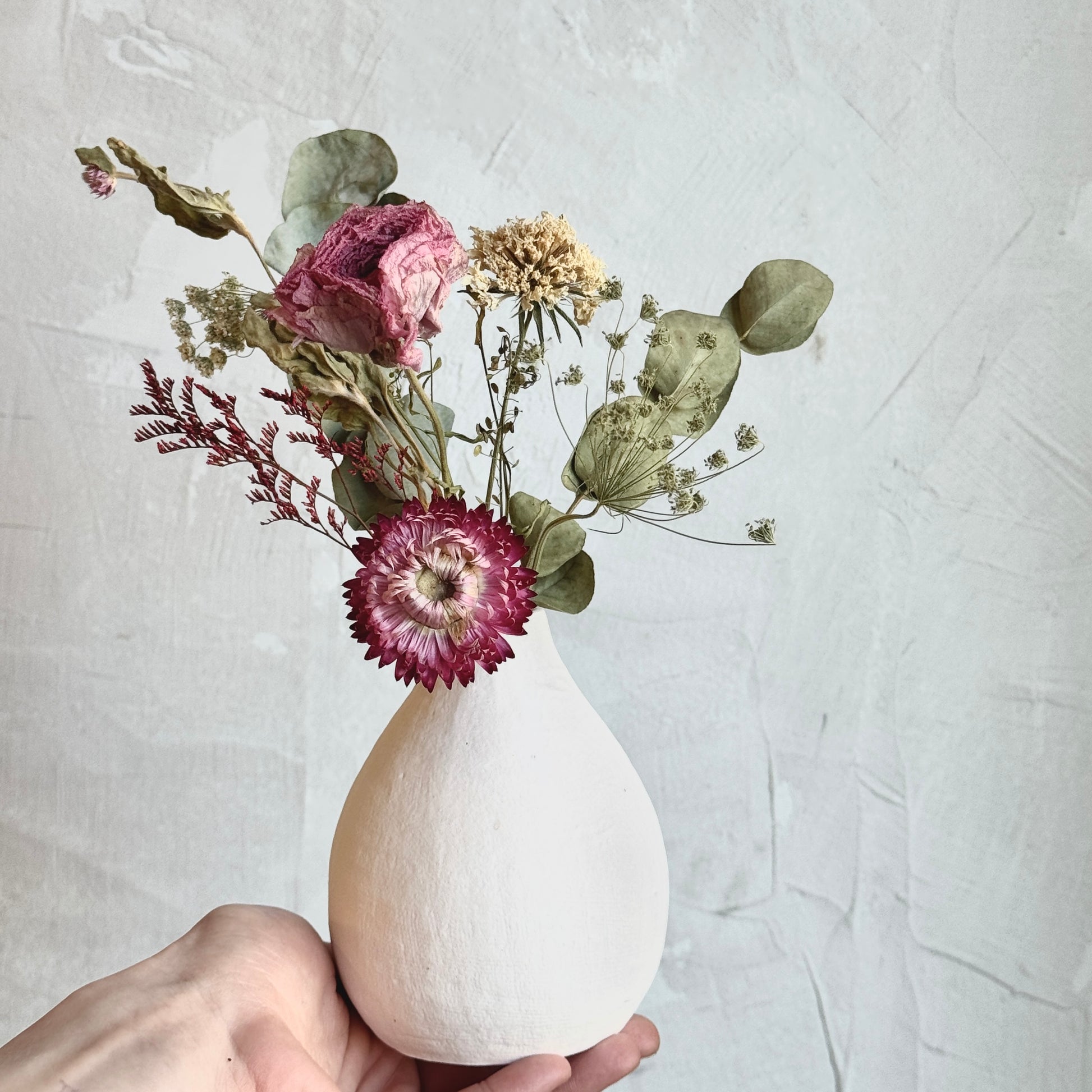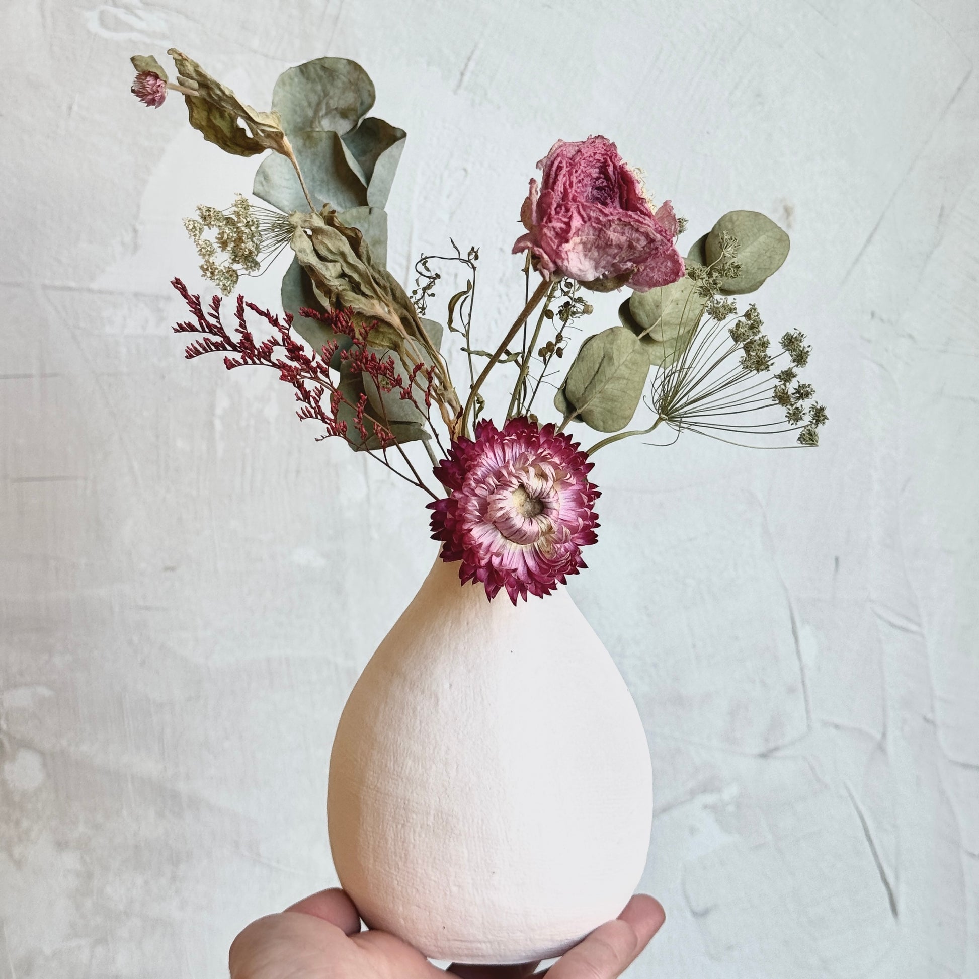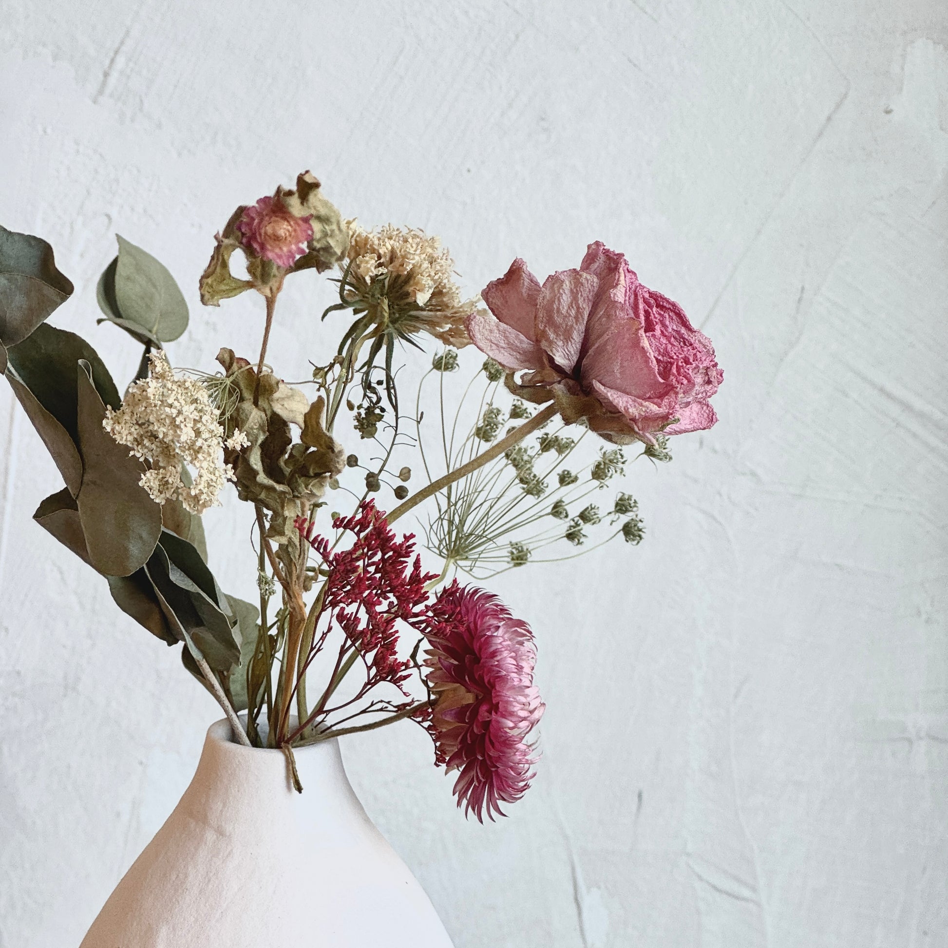 Our dried arrangements are made using stems that we get in fresh, allowing us to have zero waste in our shop! They are also all one of a kind and will differ from what's pictured. Dried flowers are everlasting and don't require any care or upkeep. We do recommend that they are kept in dry places, avoiding direct sunlight.