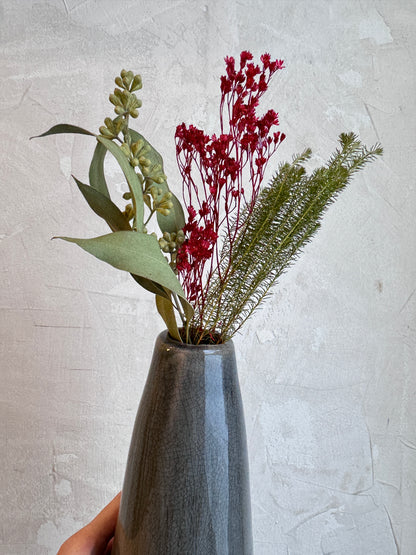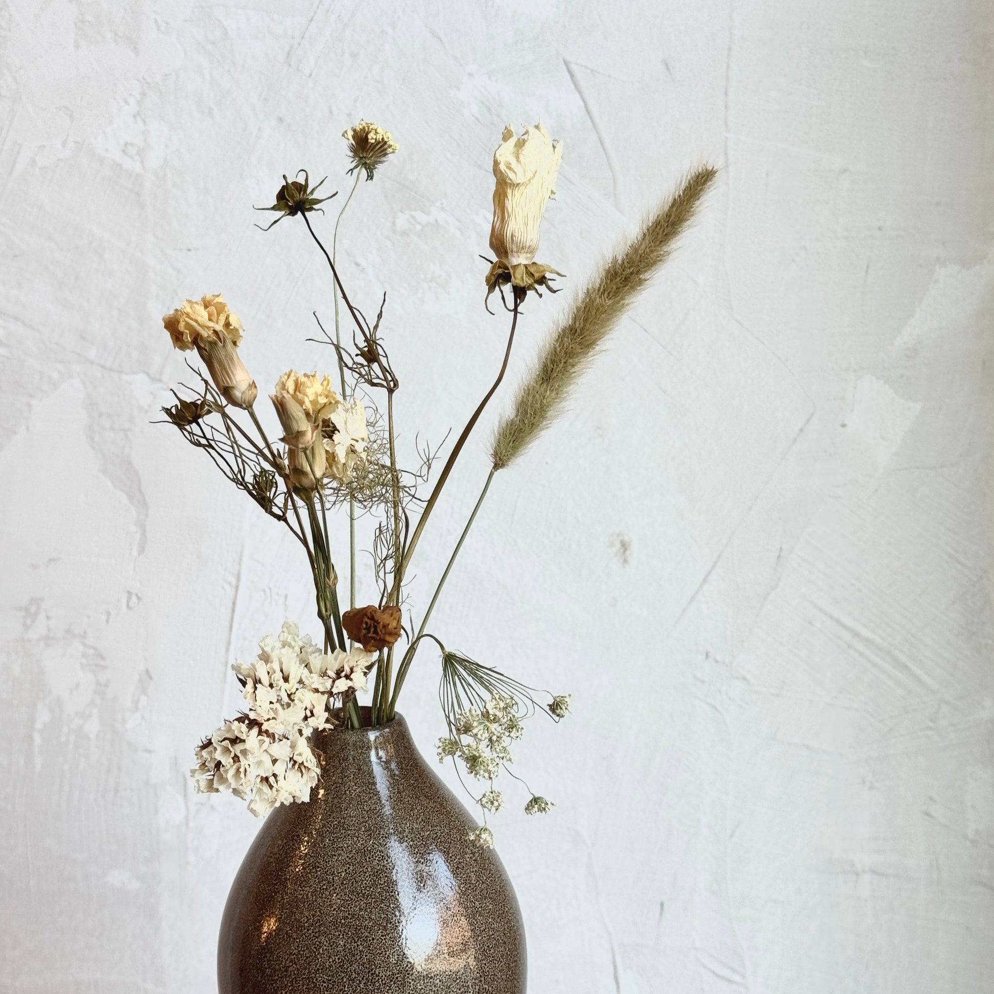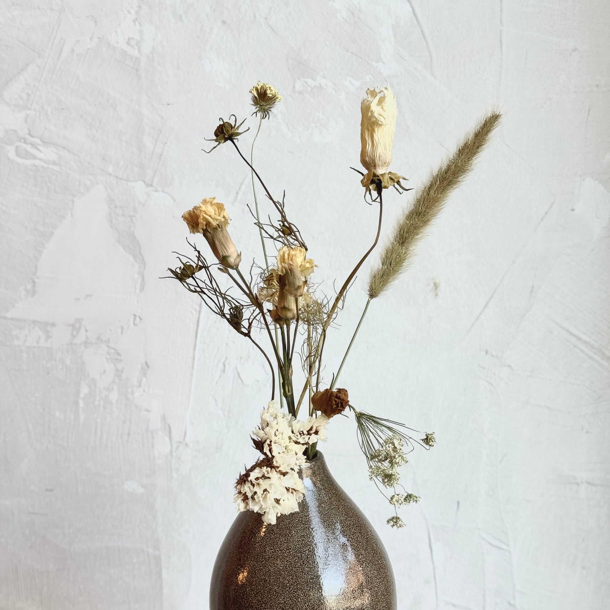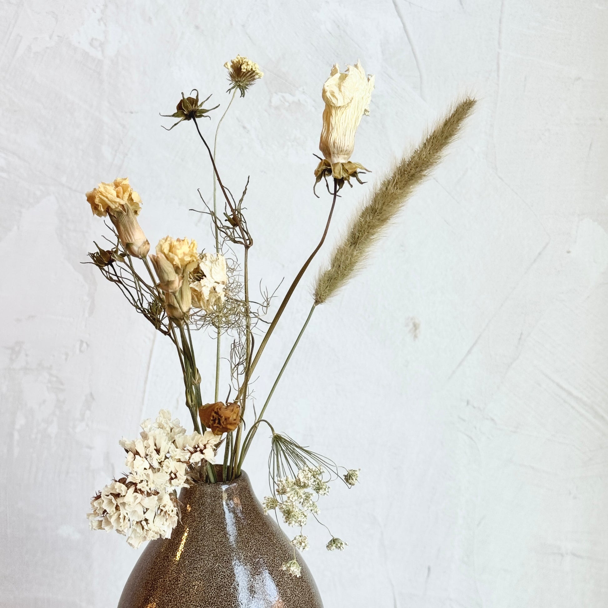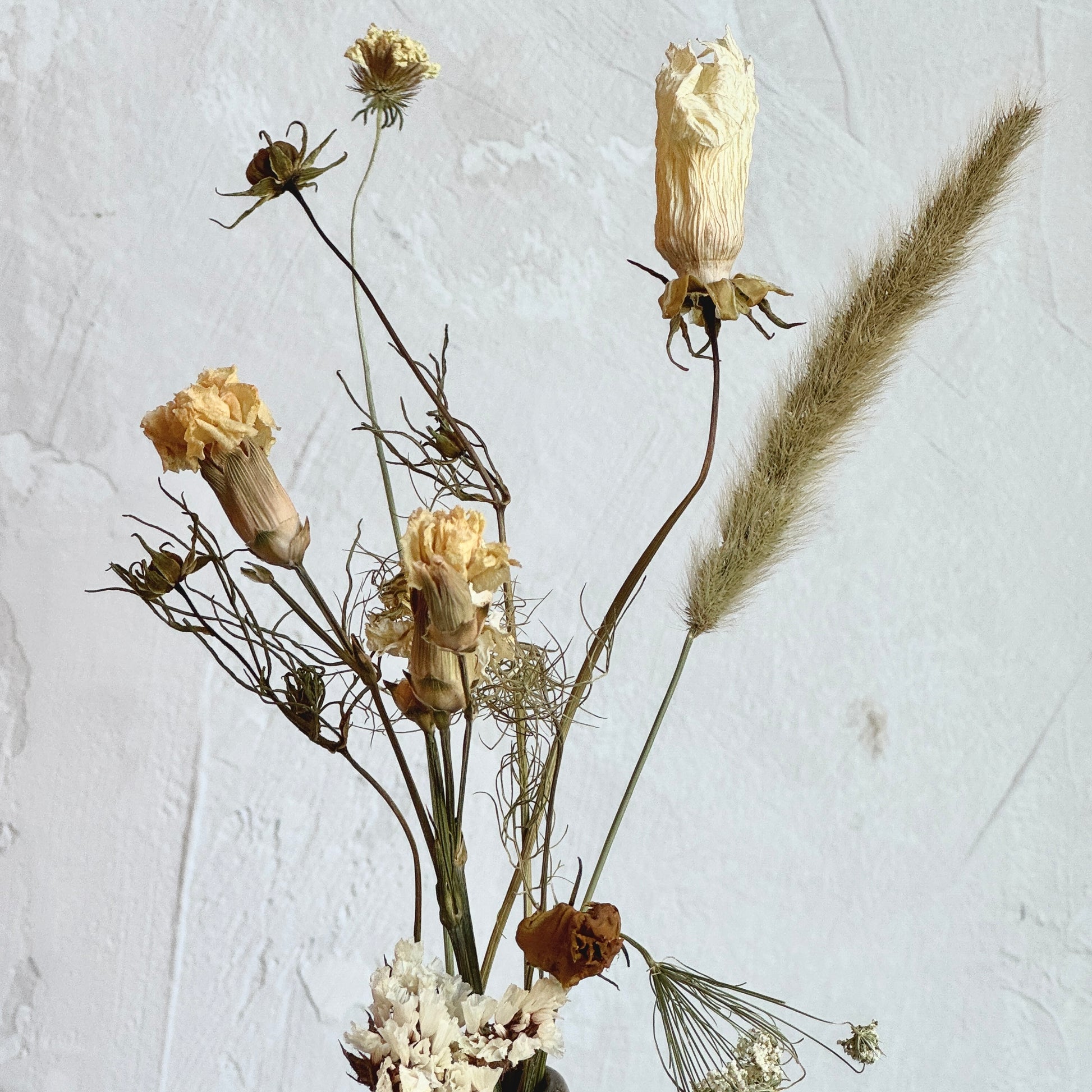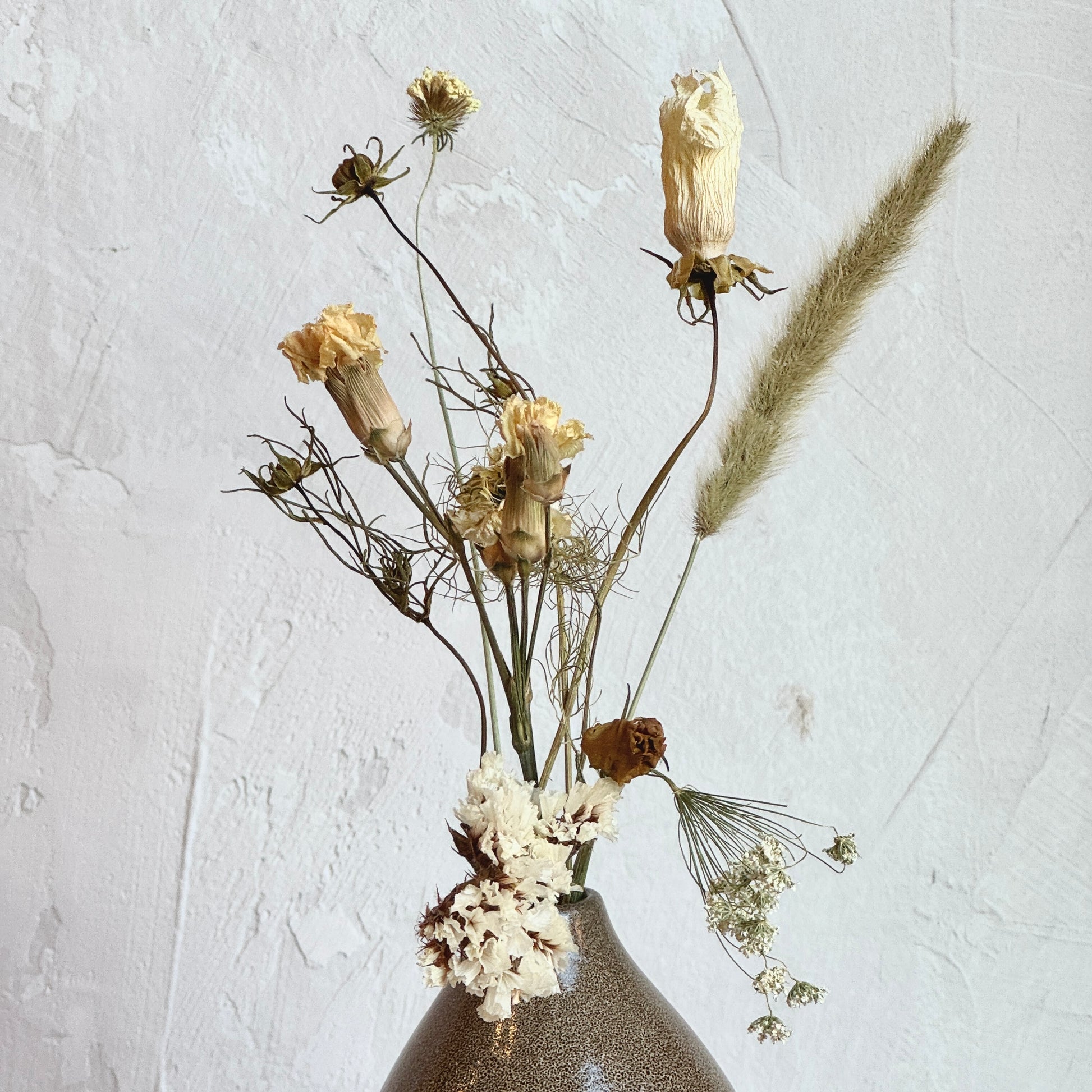 Our dried arrangements are made using stems that we get in fresh, allowing us to have zero waste in our shop! They are also all one of a kind and will differ from what's pictured. Dried flowers are everlasting and don't require any care or upkeep. We do recommend that they are kept in dry places, avoiding direct sunlight.