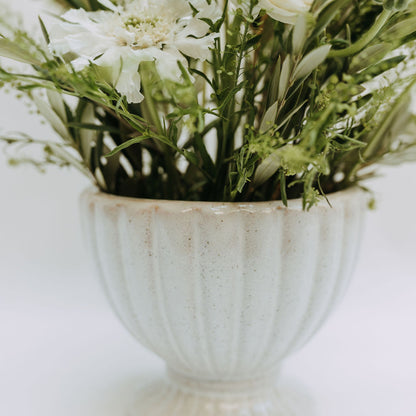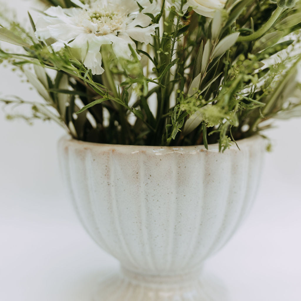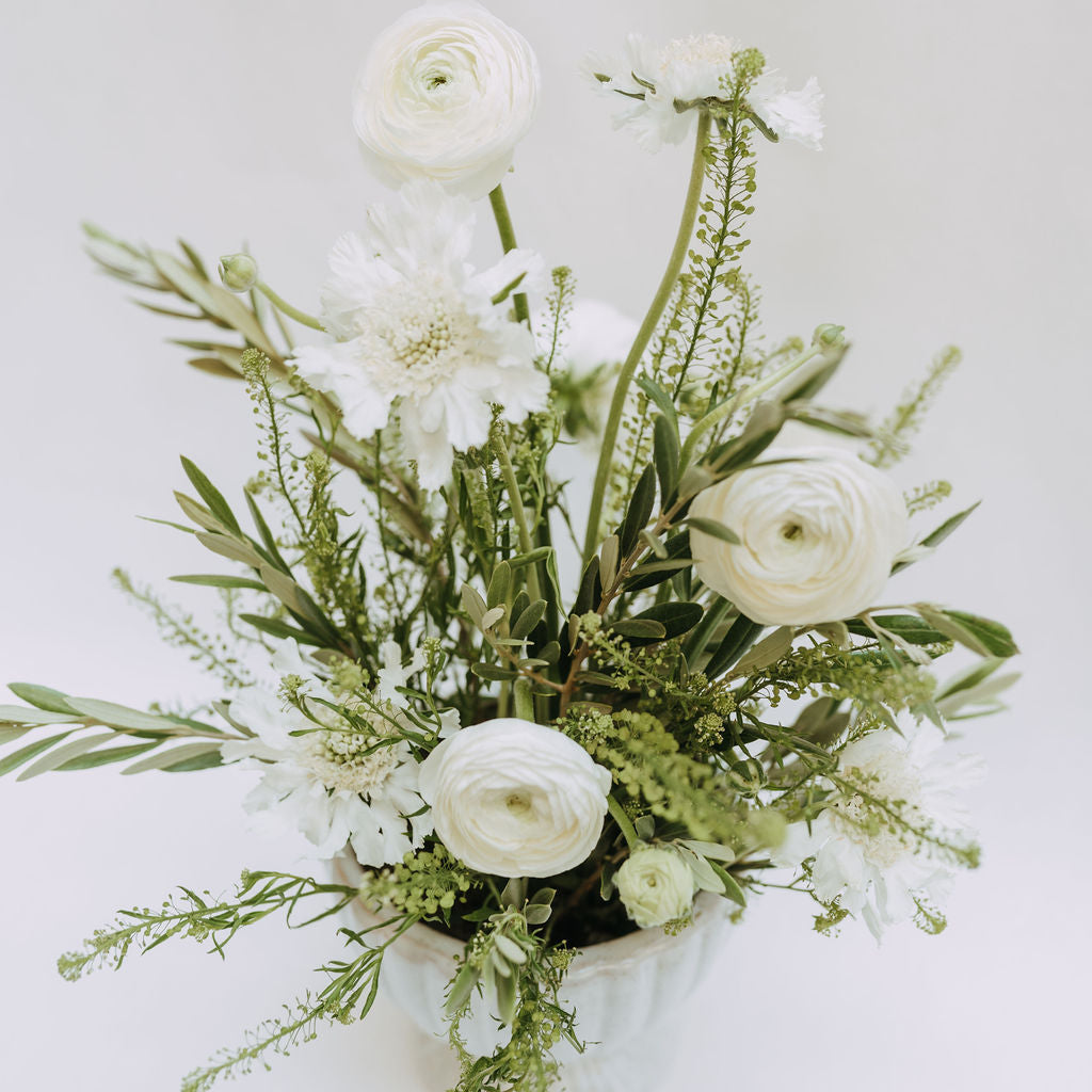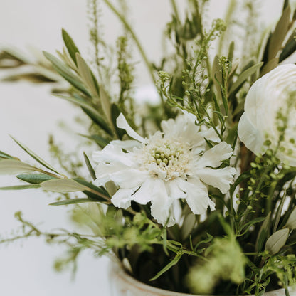The Elliot arrangement is made using a variety of fresh seasonal greenery, paired with cream and white blooms featured in a pedestal vase.