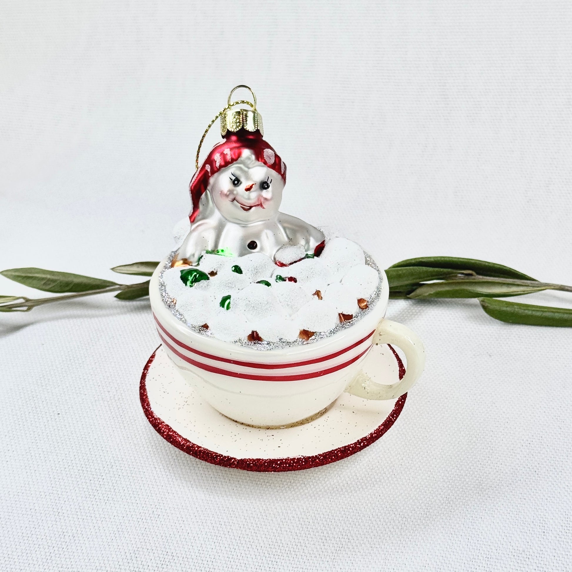 A glass ornament featuring a snowmen in the hot chocolate cup.
