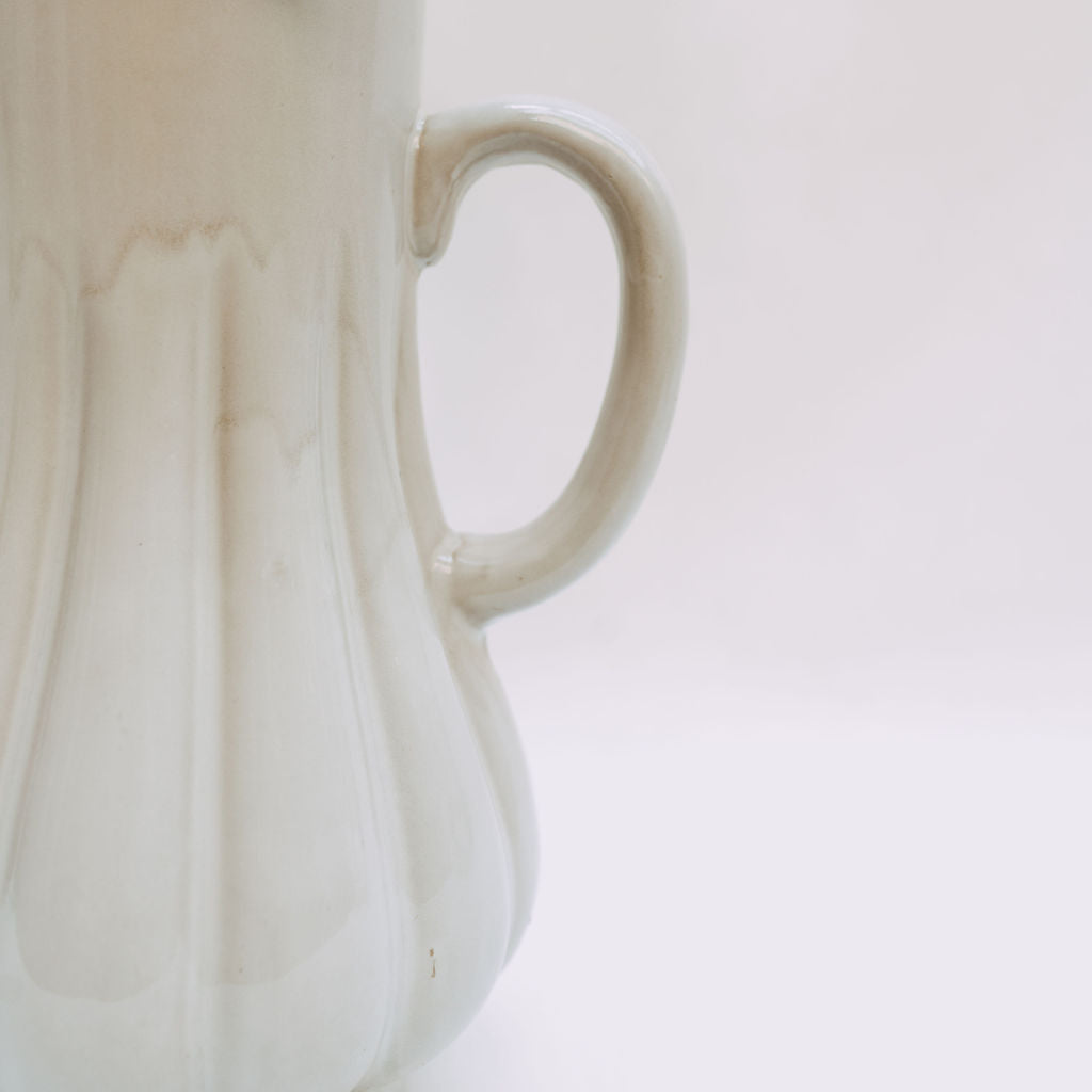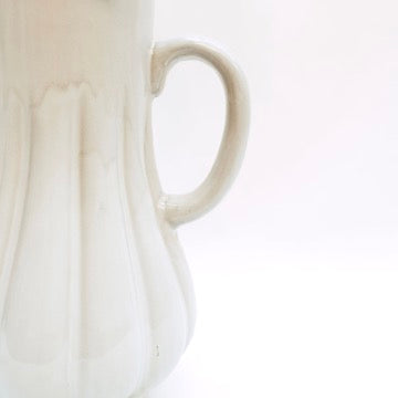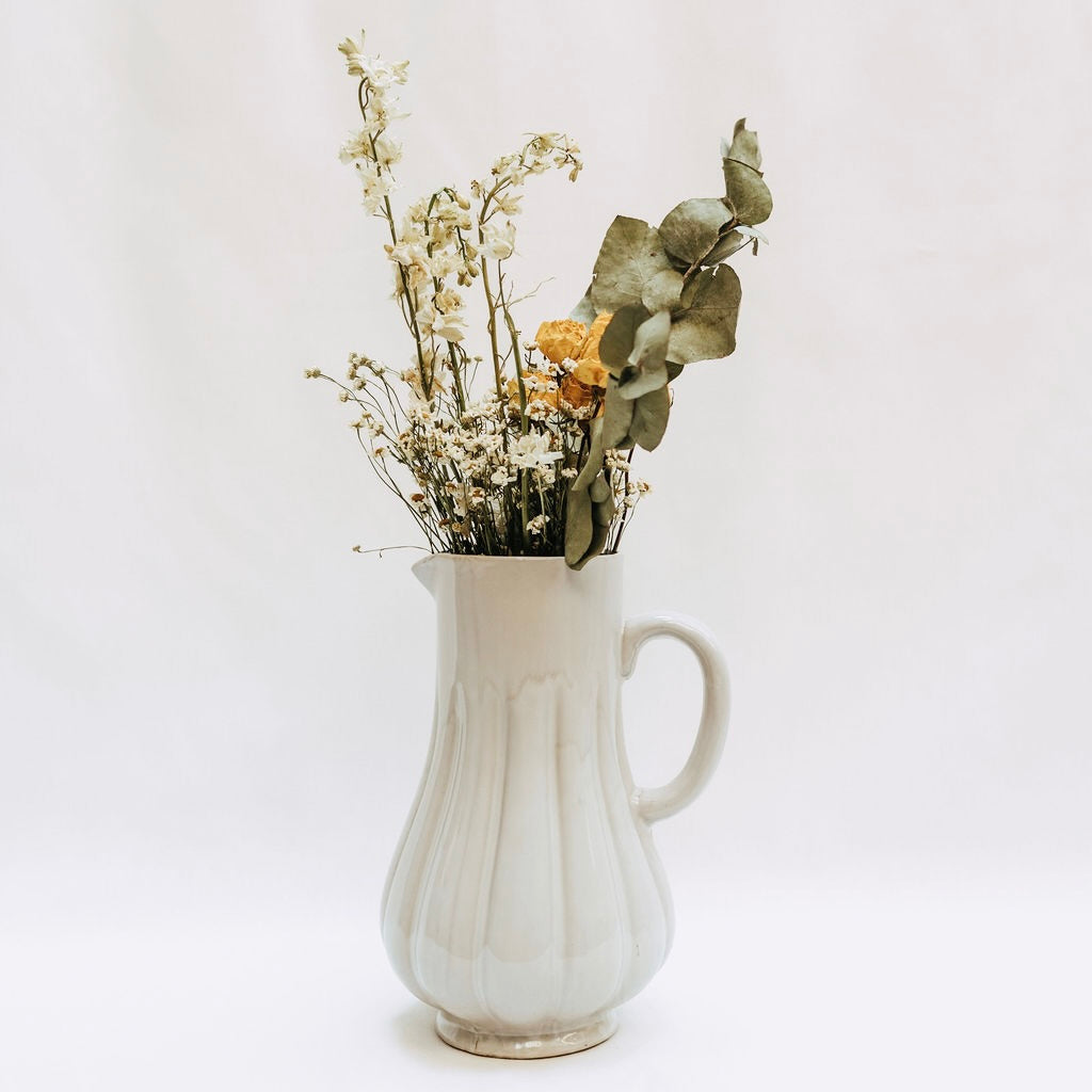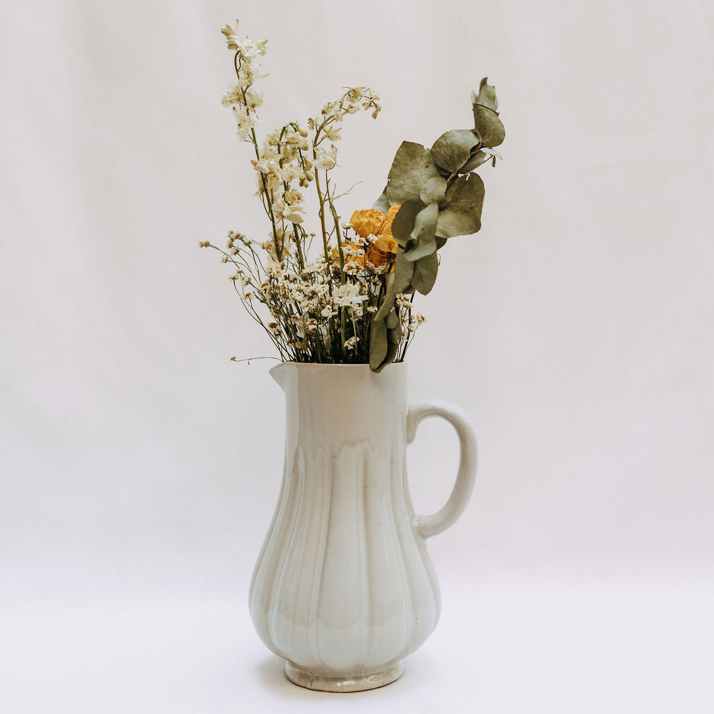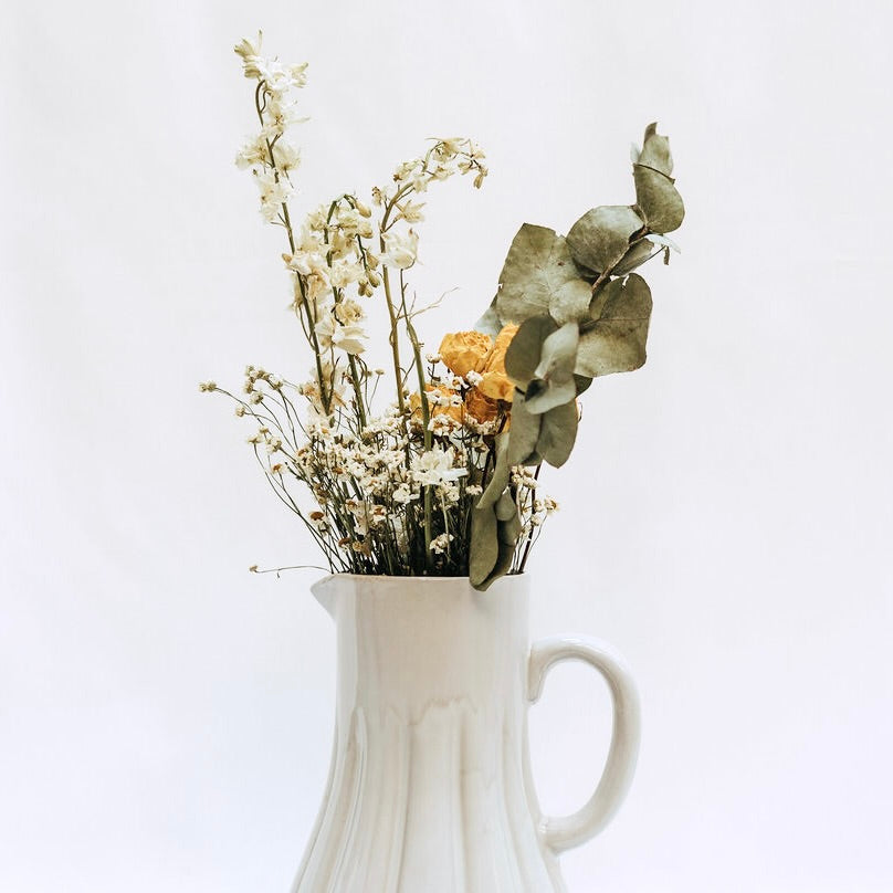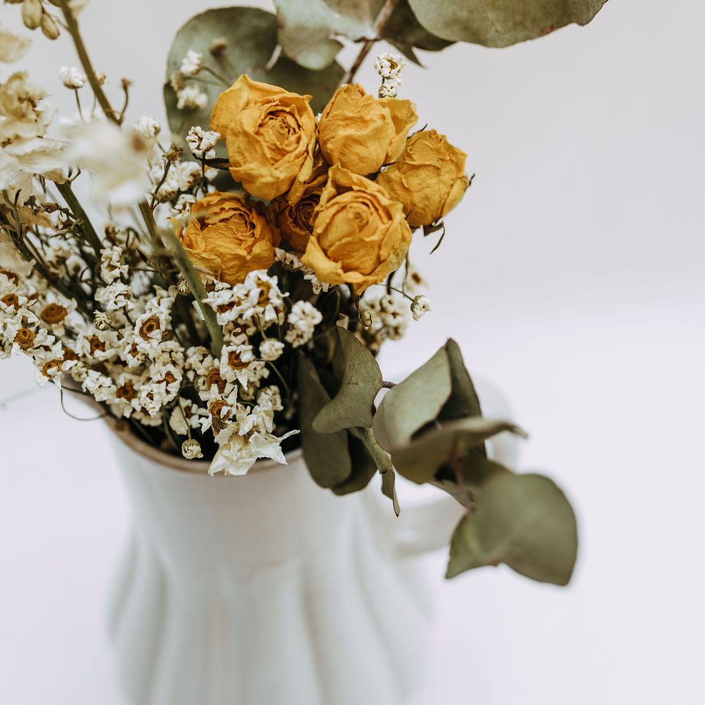 The Lenny Arrangement features dried yellow spray roses paired with eucalyptus and daisies placed in a white vintage-esque pitcher.