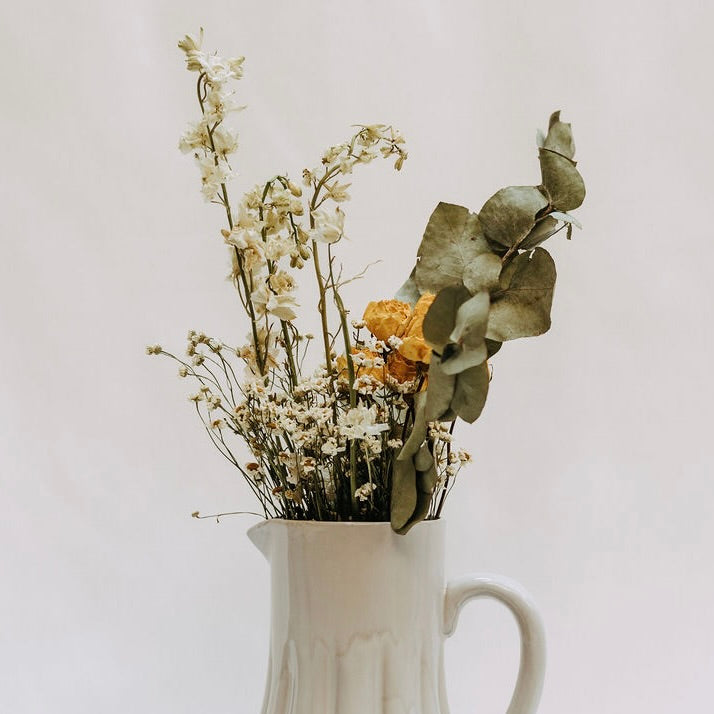 Our dried arrangements are made using stems that we get in fresh, allowing us to have zero waste in our shop! Dried flowers are everlasting and don't require any care or upkeep. We do recommend that they are kept in dry places, avoiding direct sunlight.