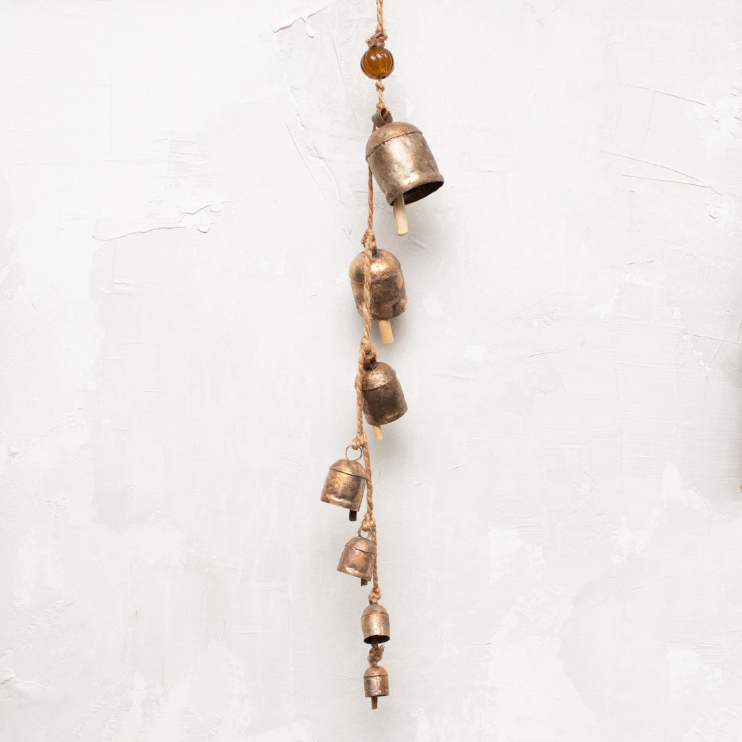 A rope holding seven bells in ascending order and a single amber coloured bead.