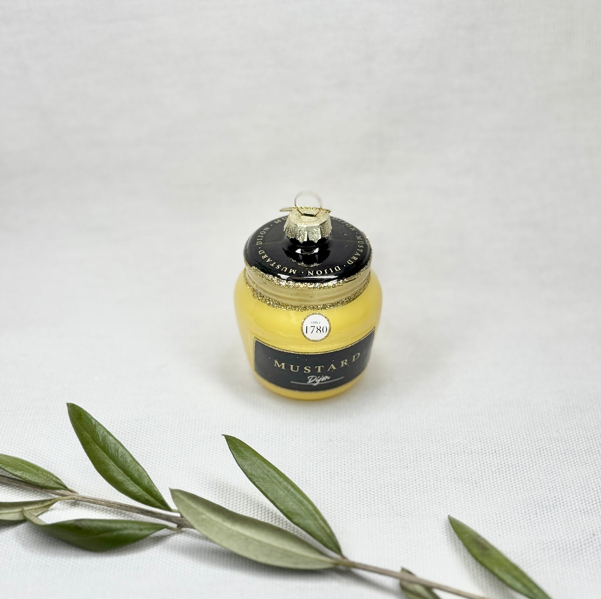 A vibrant glass ornament in the shape of a mustard jar, featuring a glossy finish and gold glitter.