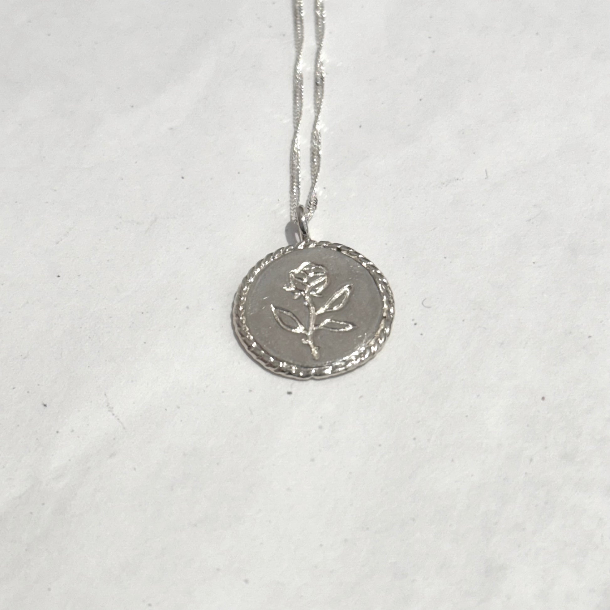 The Rose Coin necklace features a vintage-inspired, engraved coin pendant with a beautifully detailed rose motif.