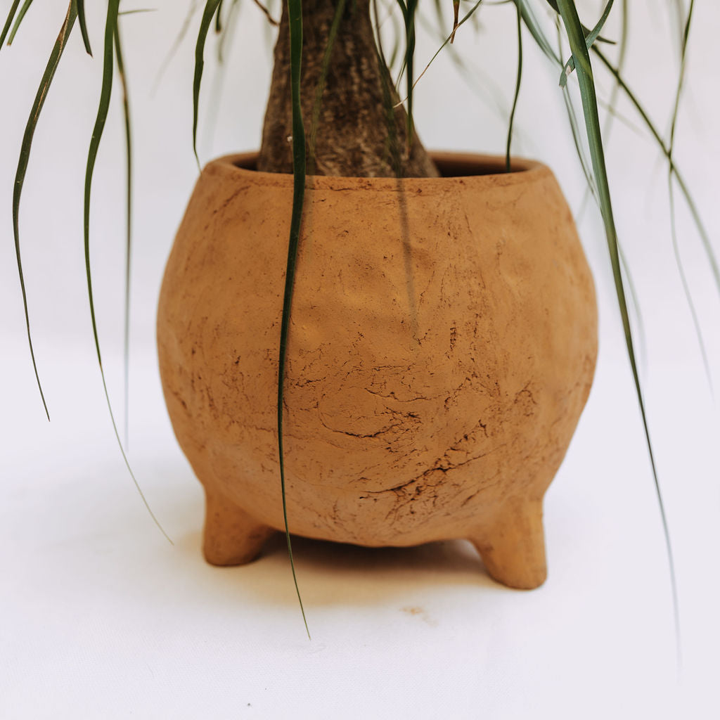 Hand formed clay round pot with 3 feet. Place a plant or bouquet inside.
