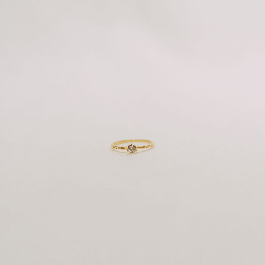 14K solid yellow gold with a beautiful 4mm .25 CT salt and pepper diamond. The band is engraved with symmetrical olive branches. Hand carved in wax and cast in recycled metal.