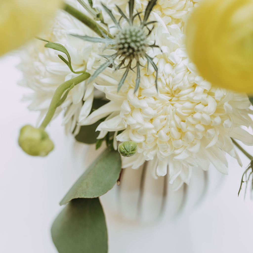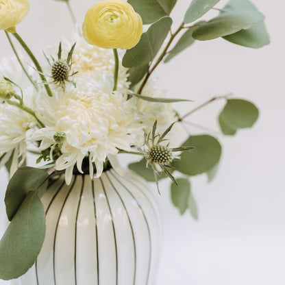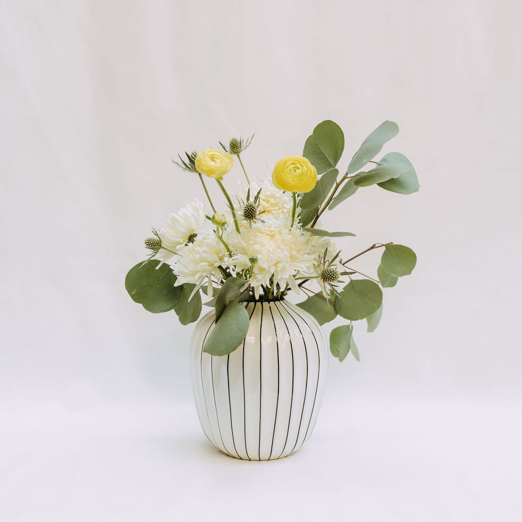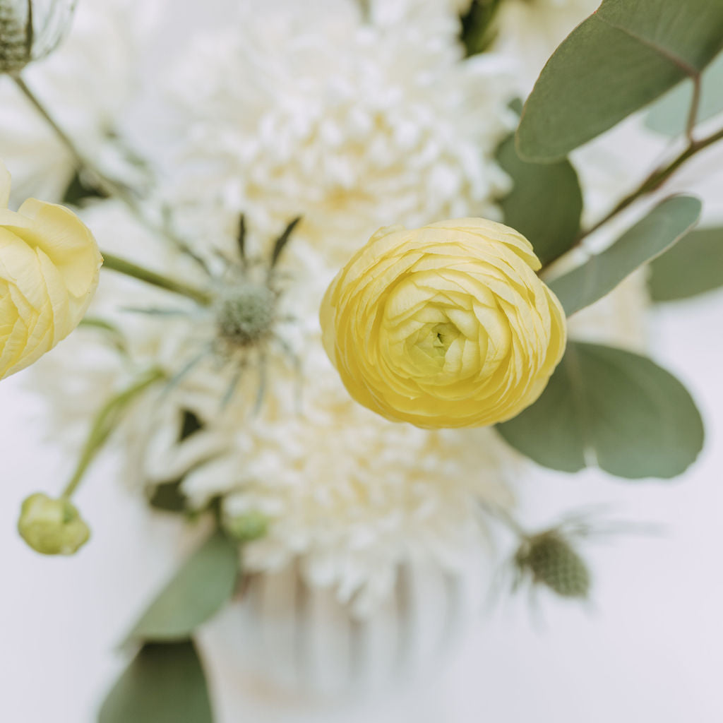 A light + airy arrangement featuring colourful ranunculus, fresh eucalyptus + others in a white and black vase.