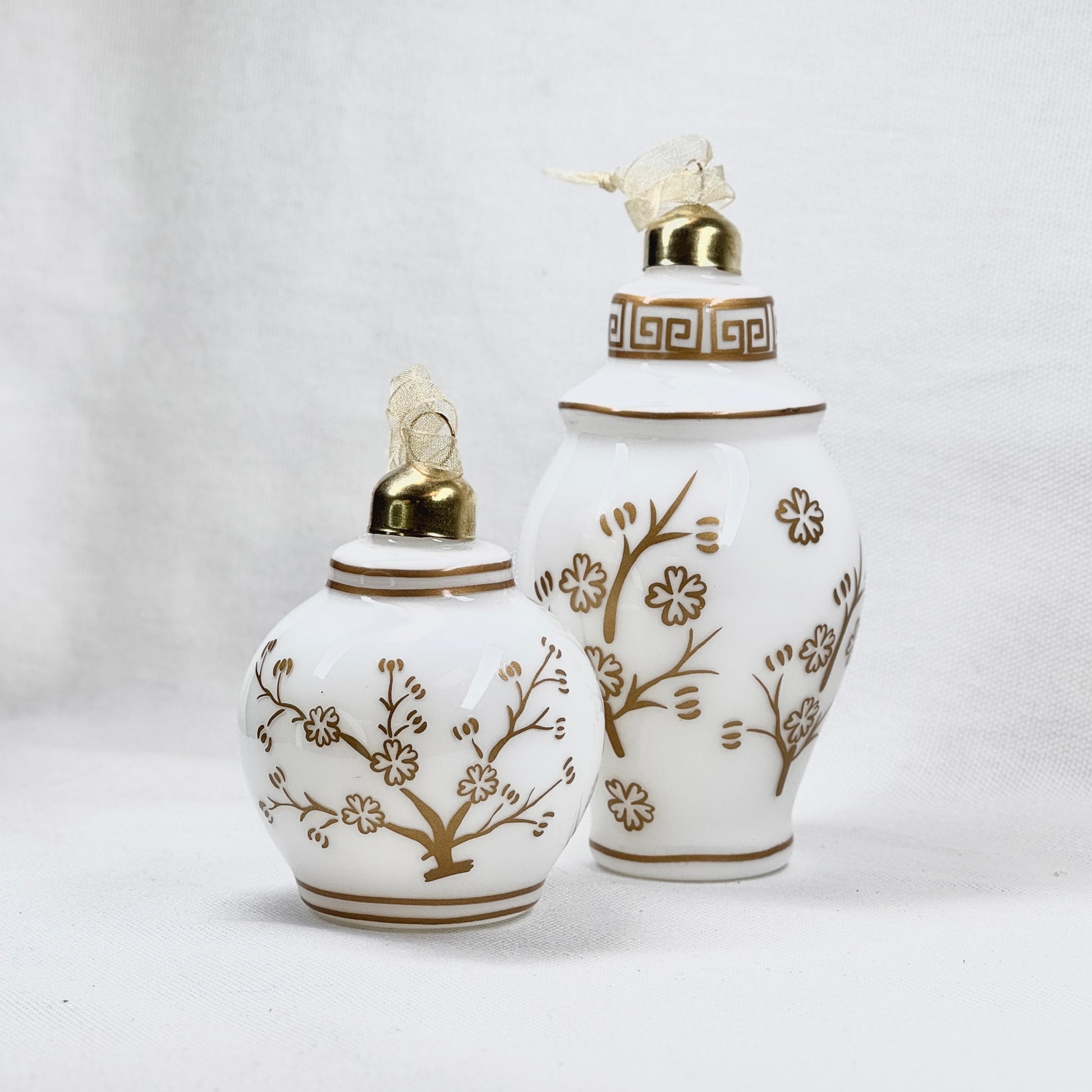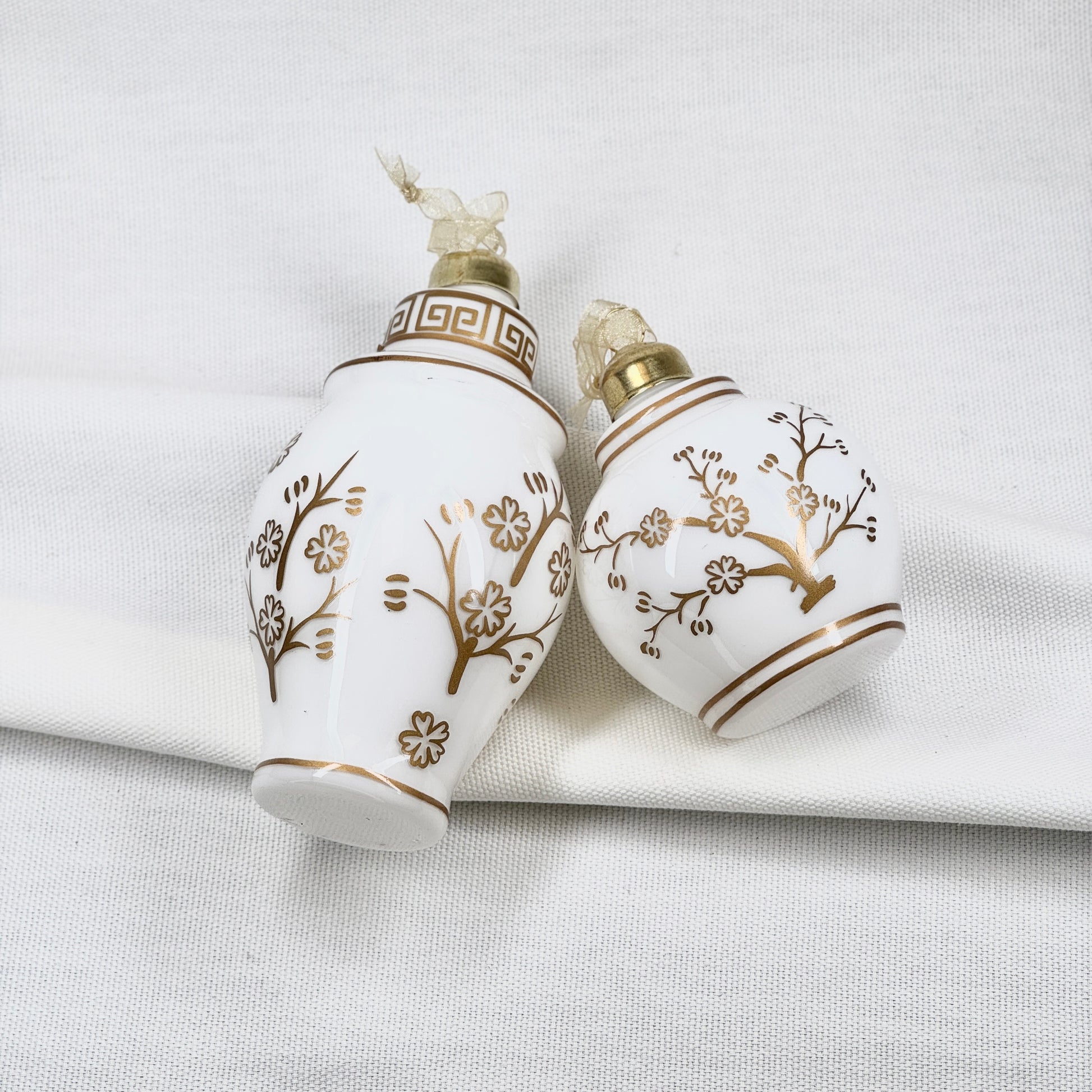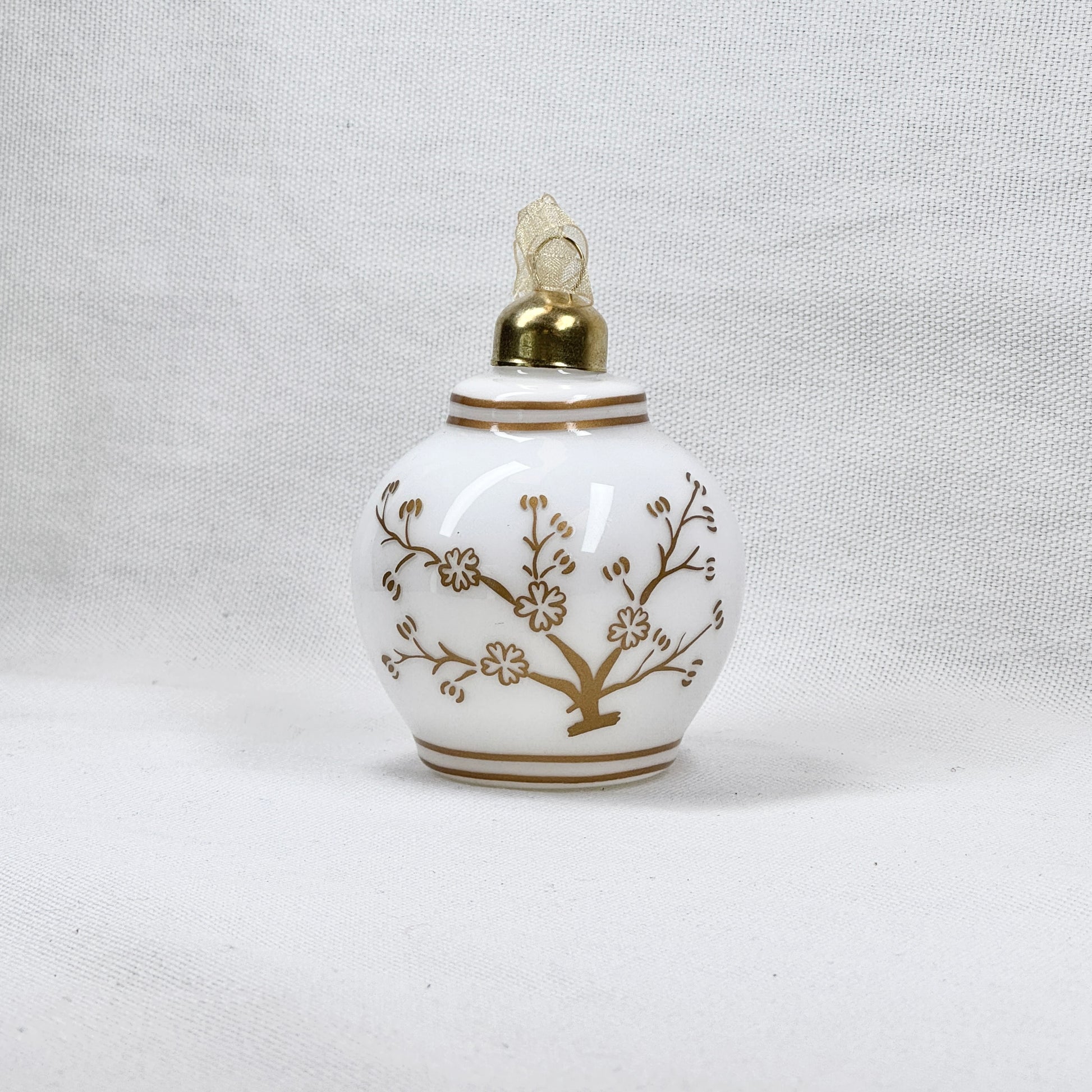 Elegant white vase ornament featuring a gold floral motif.
