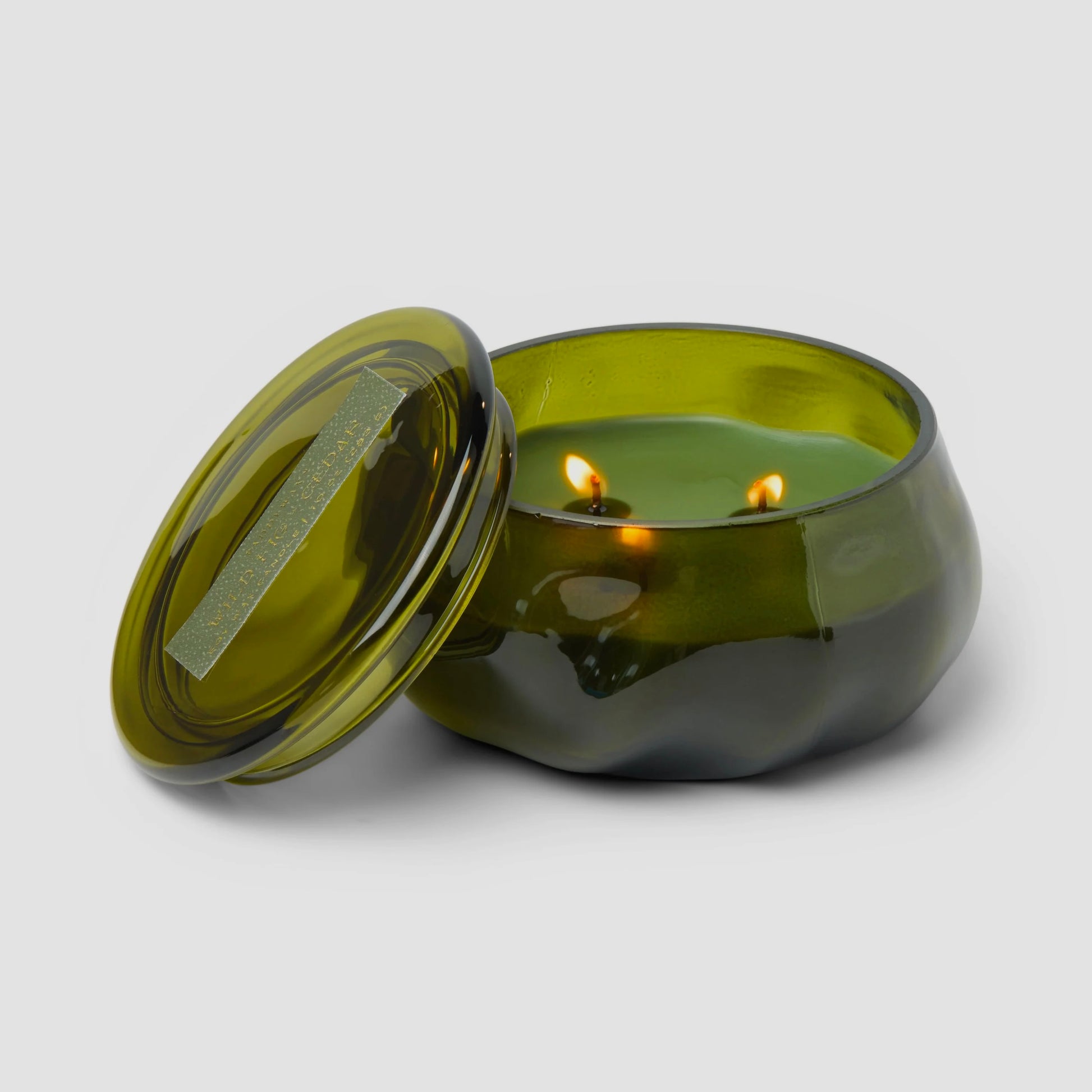 The 10 oz Wild Fig & Cedar candle combines rich, earthy woods with the sweetness of fig and a whisper of rose. Housed in a deep green glass jar with a matching lid, this scent is both uplifting and grounding.